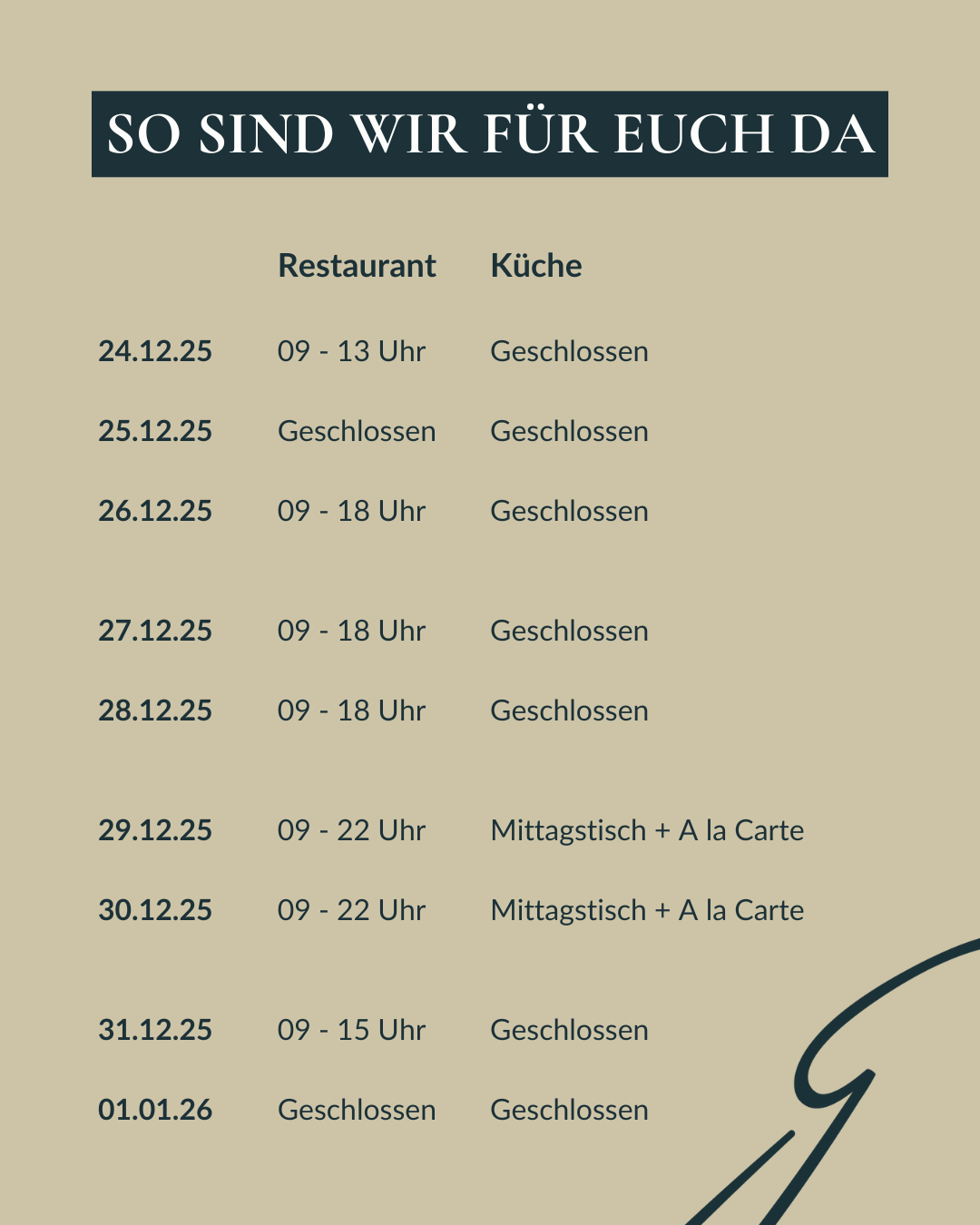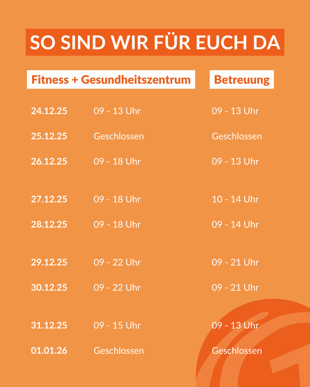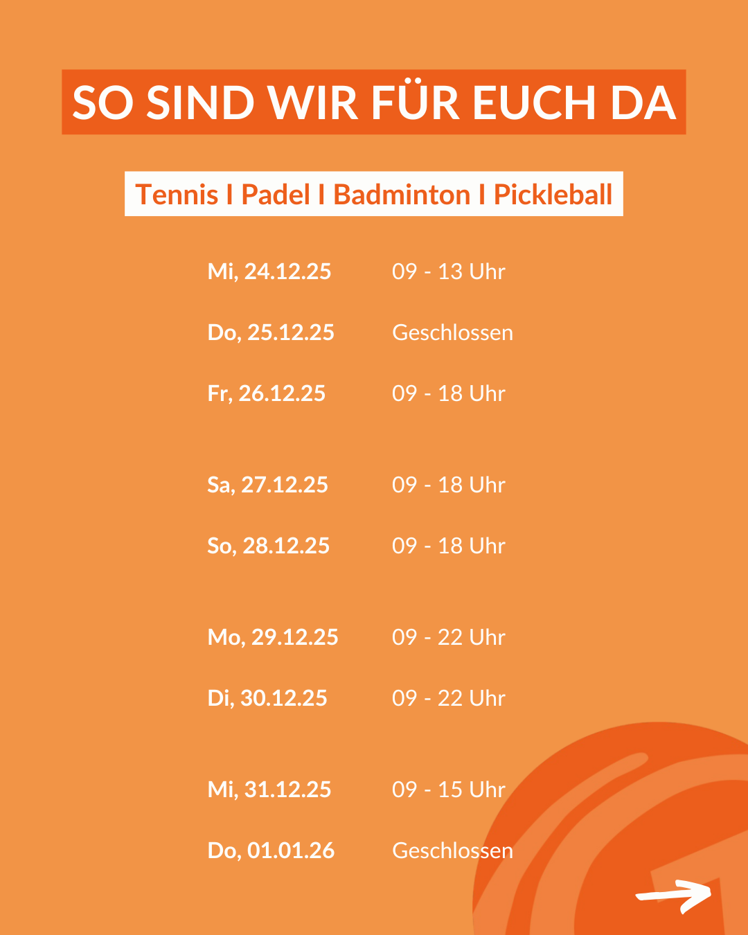 Damit ihr uns auch über die Weihnachstfeiertage fleißig besuchen könnt, haben wir hier unsere Öffnungszeiten für euch: